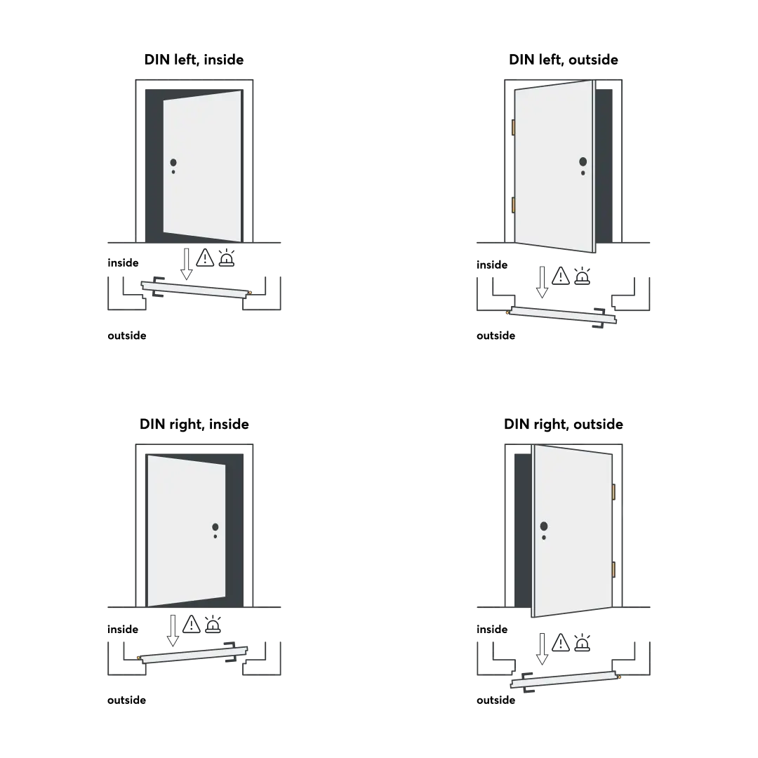 Der Türanschlag (DIN links/rechts) und die Öffnungsrichtung richten sich danach, auf welcher Seite die Bänder/Scharniere sichtbar sind, wenn du vor der Tür stehst.